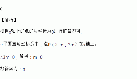 平面直角坐标系中,若点P(2-m,3m)在x轴上,则m的值为_______。