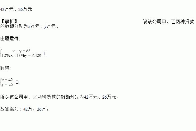 某公司向银行申请了甲 、乙两种贷款,共计68万元,每年需付出8.42万元利息。已知甲种贷款每年的利率为12%,乙种贷款每年的利率为13%,则该公司甲、乙两种贷款的数额分别为_.
