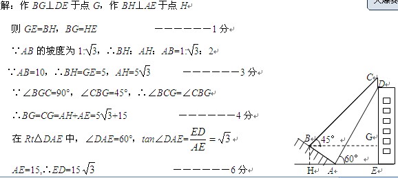 如图,某校一幢教学大楼的顶部竖有一块“传承文明,启智求真”的宣传牌CD.小明在山坡的坡脚A处测得宣传牌底部D的仰角为60°,沿山坡向上走到B处测得宣传牌顶部C的仰角为45°.已知山坡AB的坡度i=1: