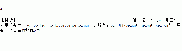 A 【解析】【解析】 设一份为x,则四个内角分别为:2x,2x,3x,5x,∴2x+2x+3x+5x=360°,解得:x=30°,∴2x=60°,3x=90°,5x=150°,只有一个直角.故选A.