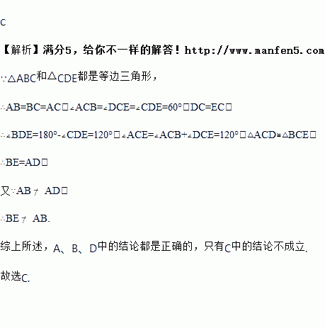 A. ∠BDE=120° B. ∠ACE=120° C. AB=BE D. AD=BE