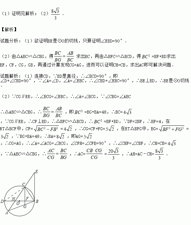如图,△ABC内接于⊙O,BD为⊙O的直径,BD与AC相交于点H,AC的延长线与过点B的直线相交于点E,且∠A=∠EBC.