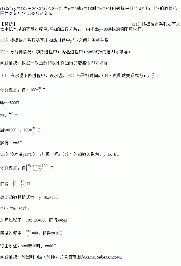 (1)写出水温下降过程中y与x之间的函数表达式,并求出x为何值时,y=100;