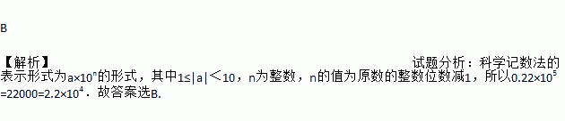B 【解析】试题分析:科学记数法的表示形式为a×10n的形式,其中1≤|a|<10,n为整数,n的值为原数的整数位数减1,所以0.22×105=22000=2.2×104.故答案选B.
