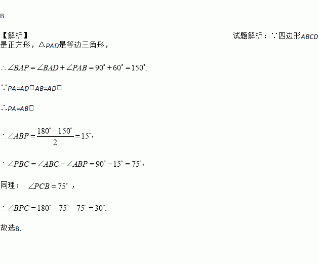 如图,四边形ABCD是正方形,△PAD是等边三角形,则∠BPC等于( )