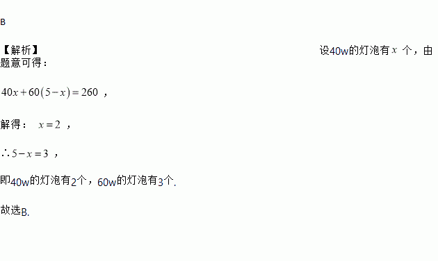 B 【解析】设40w的灯泡有个,由题意可得: , 解得: , ∴, 即40w的灯泡有2个,60w的灯泡有3个. 故选B.