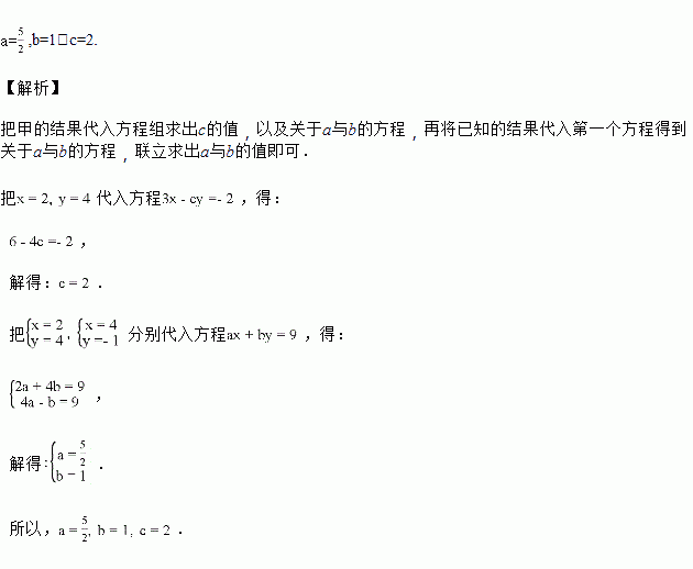 解关于x,y的方程组时,甲正确地解出,乙因为把c抄错了,误解为,求a,b,c的值.