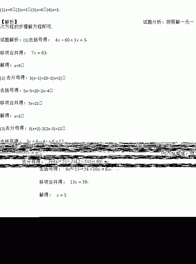 (1)4x-3(20-x)=3 (2) ;