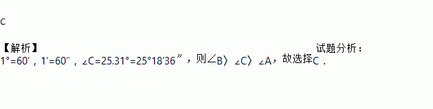 C 【解析】试题分析:1°=60′,1′=60″,∠C=25.31°=25°18′36″,则∠B〉∠C〉∠A,故选择C.