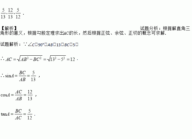 . 【解析】试题分析:根据解直角三角形的意义,根据勾股定理求出AC的长,然后根据正弦、余弦、正切的概念可求解. 试题解析:∵∠C=90°,AB=13,BC=5, ∴. ∴, , .