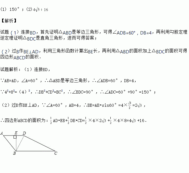 如图,在四边形ABCD中,AB=AD=4,∠A=60°,BC=4,CD=8.