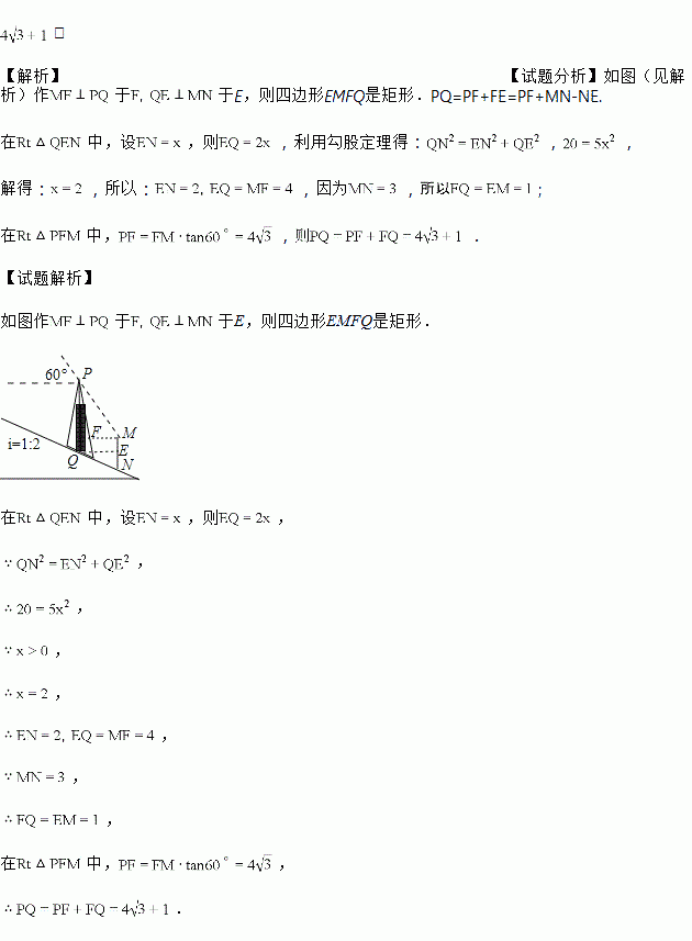 (2017四川省达州市)如图,信号塔PQ座落在坡度i=1:2的山坡上,其正前方直立着一警示牌.当太阳光线与水平线成60°角时,测得信号塔PQ落在斜坡上的影子QN长为