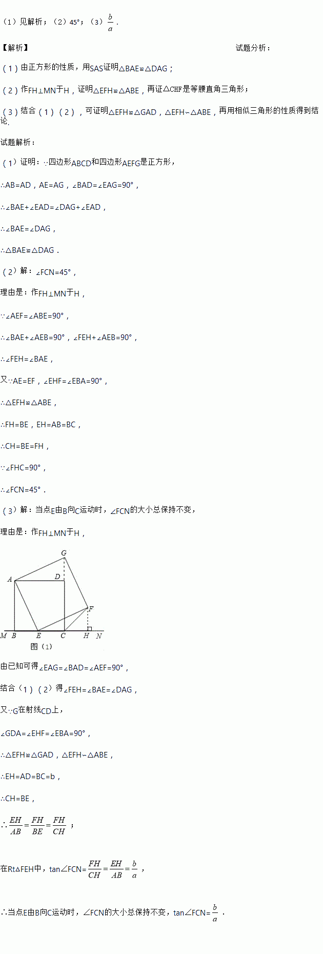 (3)如图(2),将图(1)中正方形ABCD改为矩形ABCD,AB=a,BC=b(a、b为常数),E是线段BC上一动点(不含端点B、C),以AE为边在直线MN的上方作矩形AEFG,使顶点G恰好落在射线CD上.判断当点E由B向C运动时,∠FCN的大小是否总保持不变?若∠FCN的大小不变,请用含a、b的代数式表示tan∠FCN的值;若∠FCN的大小发生改变,请举例说明.