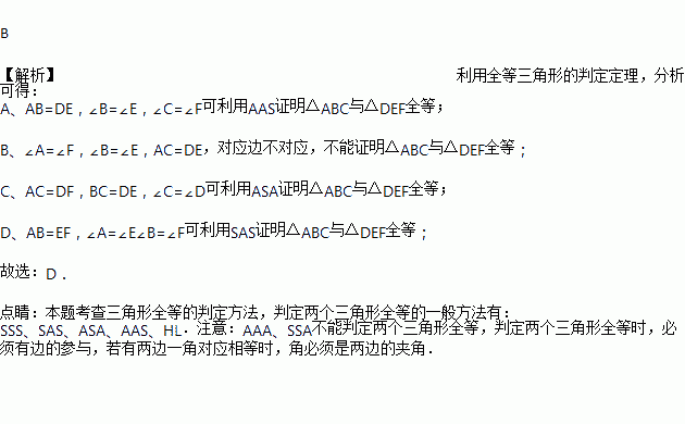 A. AB=DE,∠B=∠E,∠C=∠F B. AC=DE,∠B=∠E,∠A=∠F