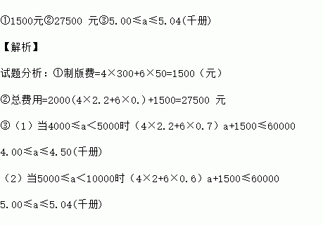 ①1500元②27500 元③5.00≤a≤5.04(千册) 【解析】 试题分析:①制版费=4×300+6×50=1500(元) ②总费用=2000(4×2.2+6×0.)+1500=27500 元 ③(1)当4000≤a<5000时(4×2.2+6×0.7)a+1500≤60000 4.00≤a≤4.50(千册) (2)当5000≤a<10000时(4×2+6...