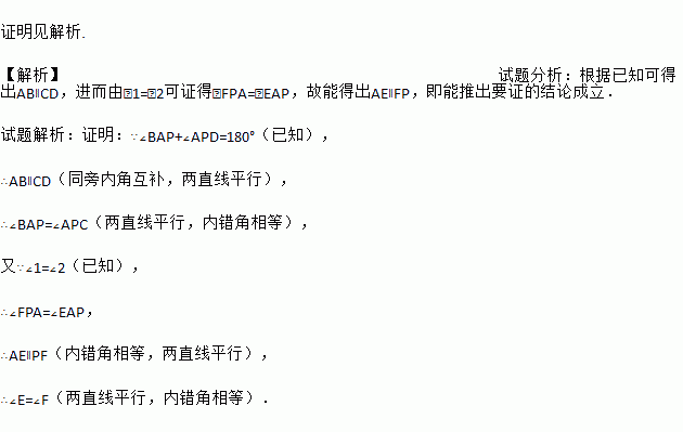 如图,∠BAP+∠APD=180°,∠1=∠2. 求证:∠E=∠F