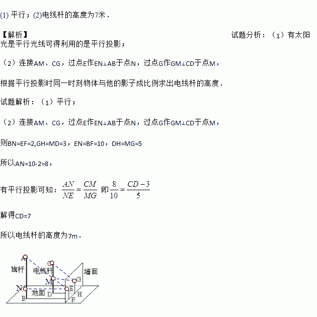 如图,在一面与地面垂直的围墙的同侧有一根高10米的旗杆AB和一根高度未知的电线杆CD,它们都与地面垂直,为了测得电线杆的高度,一个小组的同学进行了如下测量:某一时刻,在太阳光照射下,旗杆落在围墙上的影子EF的长度为2米,落在地面上的影子BF的长为10米,而电线杆落在围墙上的影子GH的长度为3米,落在地面上的影子DH的长为5米,依据这些数据,该小组的同学计算出了电线杆的高度.