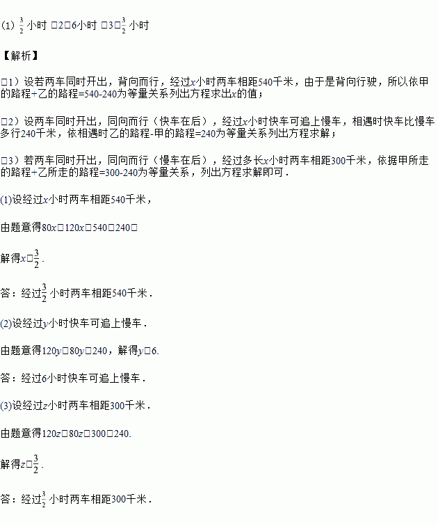 (1)若两车同时开出,背向而行,则经过多长时间两车相距540千米?