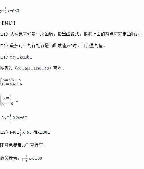 某长途汽车公司规定旅客可免费随身携带一定质量的行李,若超过规定,则需购买行李票.行李票的费用y(元)是行李质量x(千克)的一次函数,其图象如图所示,则y与x之间的函数解析式是____,旅客最多可免费携带行李____千克.