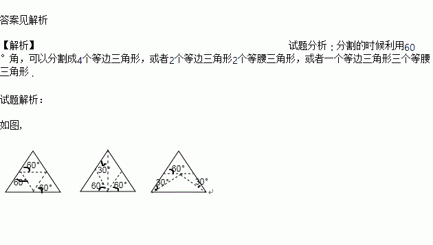 请你用3种不同的分割方法,将下列3个等边三角形分别分割成4个等腰三角形(在图中画出分割线,并且标出必要的角的度数)