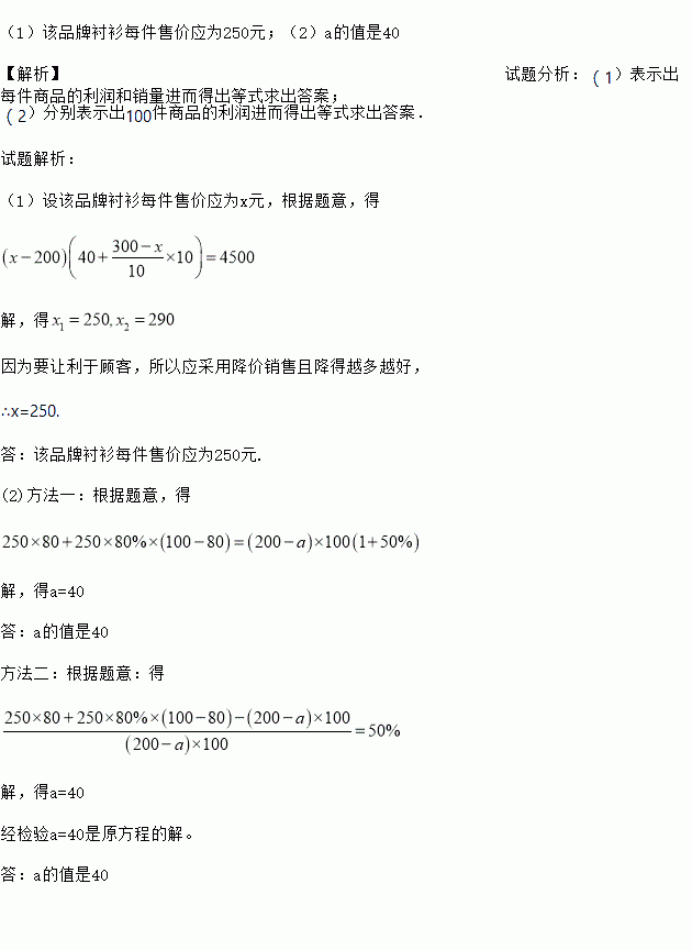 (2)该服装店将该品牌的衬衫销售完,在补货时厂家只剩100件,经协商每件降价a元,全部拿回。按(1)中的价格售出80件后,剩余的按八折销售。售完这100件衬衫获利20%,求a的值。