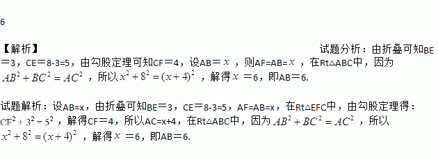 如图,矩形纸片ABCD中,已知AD=8,折叠纸片使AB边与对角线AC重合,点B落在点F处,折痕为AE,且EF=3,则AB的长为____.