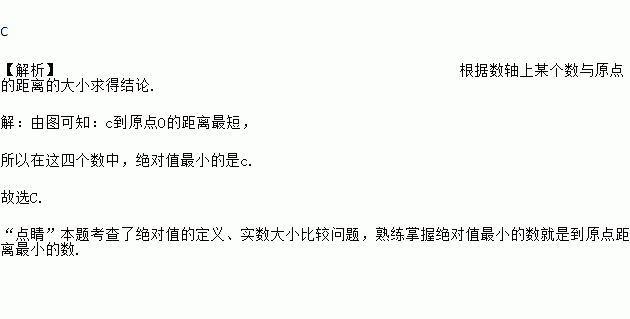 C 【解析】根据数轴上某个数与原点的距离的大小求得结论. 【解析】 由图可知:c到原点O的距离最短, 所以在这四个数中,绝对值最小的是c. 故选C. “点睛”本题考查了绝对值的定义、实数大小比较问题,熟练掌握绝对值最小的数就是到原点距离最小的数.
