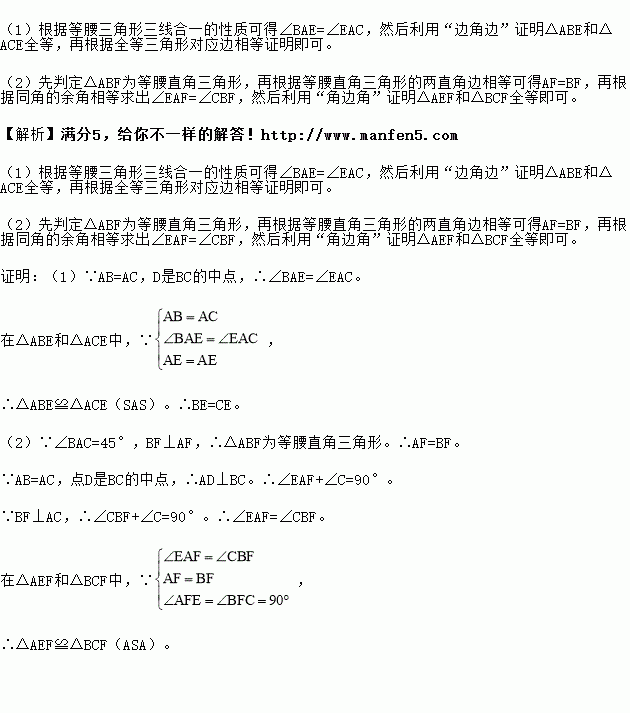 (2)如图2,若BE的延长线交AC于点F,且BF⊥AC,垂足为F,∠BAC=45°,原题设其它条件不变.求证:△AEF≌△BCF.