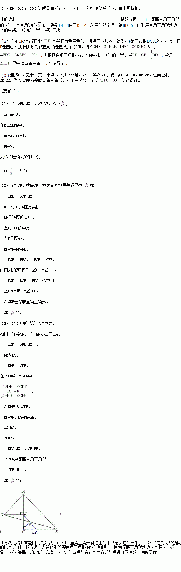 (3)将图1中的△AED绕点A顺时针旋转,使AED的一边AE恰好与△ACB的边AC在同一条直线上(如图2),连接BD,取BD的中点F,问(2)中的结论是否仍然成立,并说明理由.