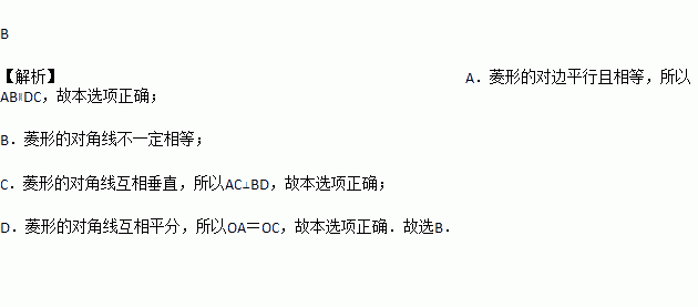 如图.在菱形ABCD中,对角线AC,BD交于点O,下列说法错误的是( )