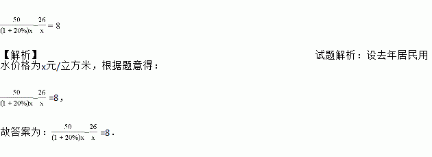 某市今年起调整居民用水价格,每立方米水费上涨20%,小方家去年12月份的水费是26元,而今年5月份的水费是50元.已知小方家今年5月份的用水量比去年12月份多8立方米,设去年居民用水价格为x元/立方米,则所列方程为________________.