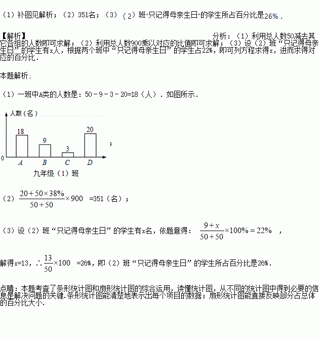 (3)若两个班中“只记得母亲生日”的学生占22%,则(2)班“只记得母亲生日”的学生所占百分比是多少?
