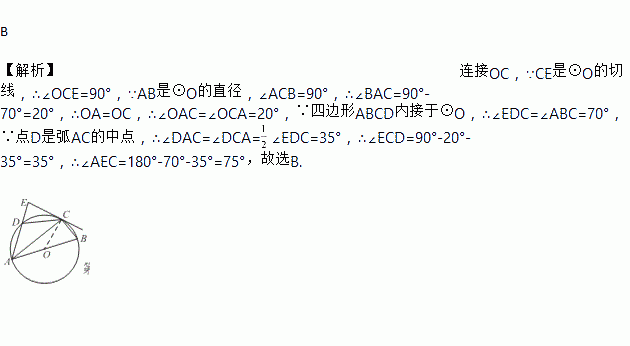 如图,圆内接四边形ABCD的边AB过圆心O,过点C的切线AD的延长线交于点E,若点D是弧AC的中点,且∠ABC=70°,则∠AEC等于( )