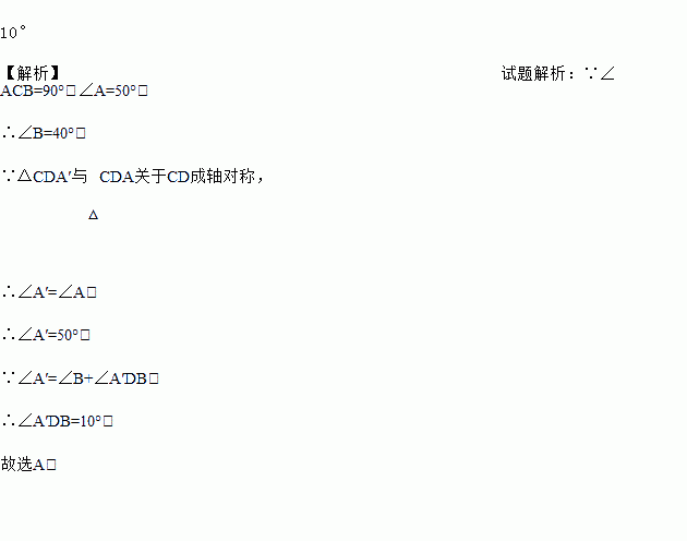 如图,Rt△ABC中,∠ACB=90°,∠A=50°,将其折叠,使点A落在边CB上A′处,折痕为CD,则∠A′DB的度数为_____.