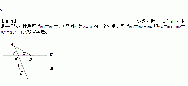 如图,直线m∥n,∠1=70°,∠2=30°,则∠A等于( )