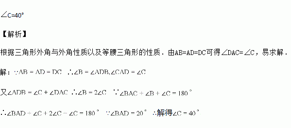 如图,在△ABC中,AB=AD=DC,∠BAD=20°,求∠C的度数?