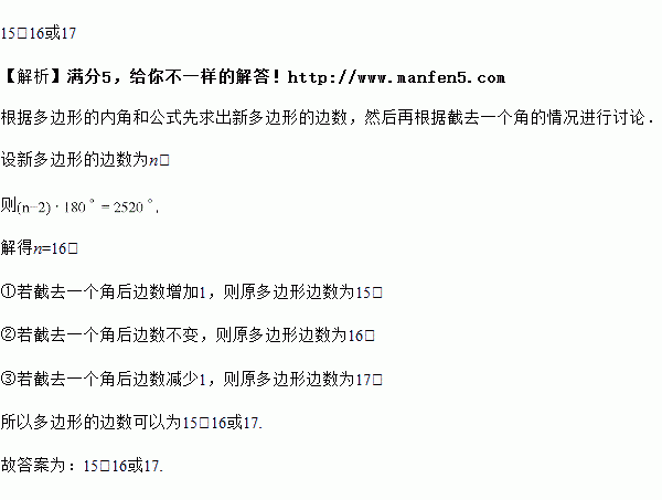 一个多边形剪去一个内角后,得到一个内角和为2520°的新多边形,则原多边形的边数为________.
