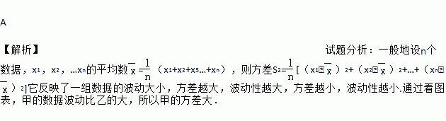 A 【解析】试题分析:一般地设n个数据,x1,x2,…xn的平均数=(x1+x2+x3…+xn),则方差S2=[(x1﹣)2+(x2﹣)2+…+(xn﹣)2]它反映了一组数据的波动大小,方差越大,波动性越大,方差越小,波动性越小.通过看图表,甲的数据波动比乙的大,所以甲的方差大.