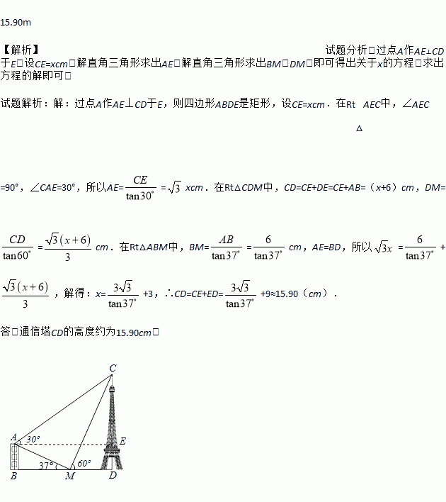 如图,建筑物AB的高为6m,在其正东方向有一个通信塔CD,在它们之间的地面点M(B,M,D三点在一条直线上)处测得建筑物顶端A,塔顶C的仰角分别为37°和60°,在A处测得塔顶C的仰角为30°,则通信塔CD的高度.(精确到0.01m)