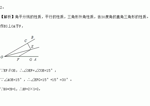 如图,∠AOE=∠BOE=15°,EF∥OB,EC⊥OB,若EC=1,则EF= ▲ .