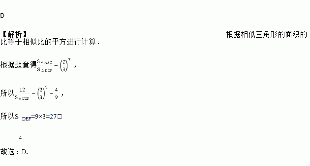 若△ABC∽△DEF,相似比为2:3,且△ABC的面积为12,则△DEF的面积为( )