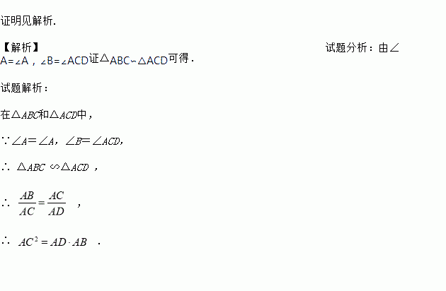 已知:如图,D是△ABC的边AB上一点,且∠B=∠ACD.求证:AC2=AD•AB.