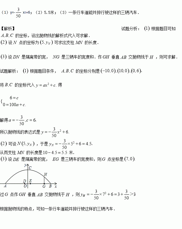 (3)拱桥下地平面是双向行车道(正中间是一条宽2m的隔离带),其中的一条行车道能否并排行驶宽2m、高3m的三辆汽车(汽车间的间隔忽略不计)?请说说你的理由.