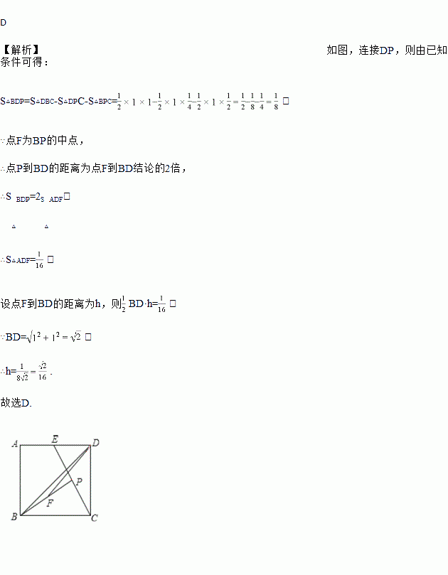 如图,正方形ABCD的边长为1,E为AD中点,P为CE中点,F为BP中点,则F到BD的距离等于( )