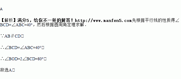 如图,在⊙O中,弦AB∥CD,若∠ABC=40°,则∠BOD=( )