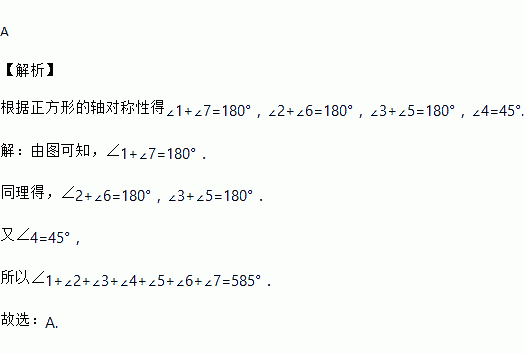 如图,是一个4×4的正方形网格,∠1+∠2+∠3+∠4+∠5+∠6+∠7等于( )