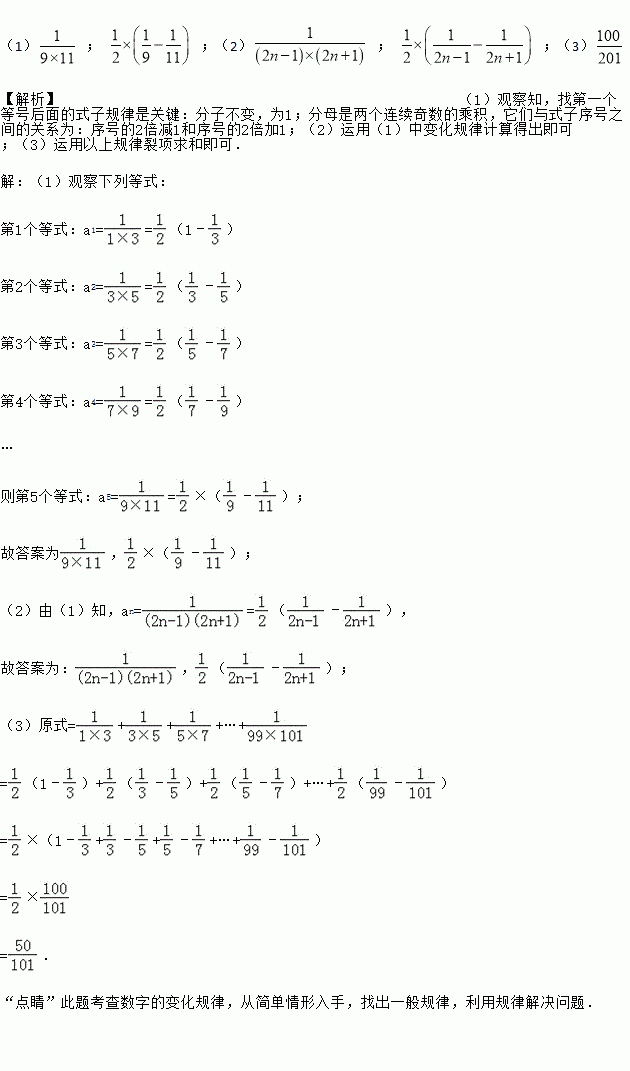 (1) ; ;(2) ; ;(3) 【解析】(1)观察知,找第一个等号后面的式子规律是关键:分子不变,为1;分母是两个连续奇数的乘积,它们与式子序号之间的关系为:序号的2倍减1和序号的2倍加1;(2)运用(1)中变化规律计算得出即可;(3)运用以上规律裂项求和即可. 【解析】 (1)观察下列等式: 第1个等式:a1==(1﹣) 第2个等式:a2==(﹣) 第3个等式...