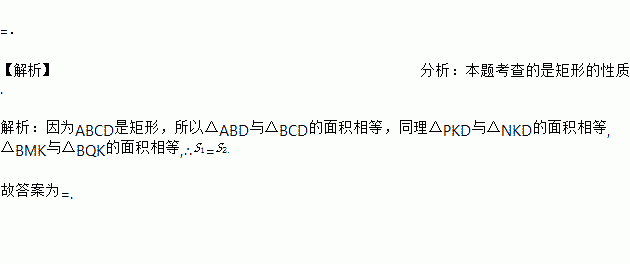 如图,过矩形ABCD的对角线BD上一点K分别作矩形两边的平行线MN与PQ,那么图中矩形AMKP的面积S1与矩形QCNK的面积S2的关系是S1 S2(填“>”或“<”或“=”)