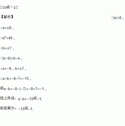 -15或-1. 【解析】∵|a|=8, ∴a=±8, ∵b²=49, ∴b=±7, ∵|a?b|=b?a, ∴a=?8,b=±7, ∴a?b=?8?7=?15, 或a?b=?8?(?7)=?8+7=?1, 综上所述,a?b=?15或?1. 故答案为:?15或?1.