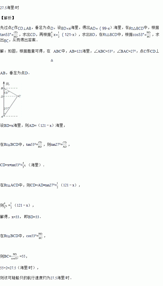如图,禁渔期间,我渔政船在A处发现正北方向B处有一艘可疑船只,测得A、B两处距离为99海里,可疑船只正沿南偏东53°方向航行.我渔政船迅速沿北偏东27°方向前去拦截,2小时后刚好在C处将可疑船只拦截.求该可疑船只航行的速度.
